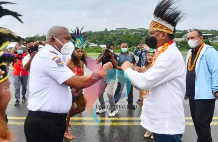 Ikut dalam penyambutan itu TP PKK Roma Megawanty Pasaribu Waterpauw, SKom, MSi, serta Bupati Fakfak Untung Tamsil dan Fatima Bauw.