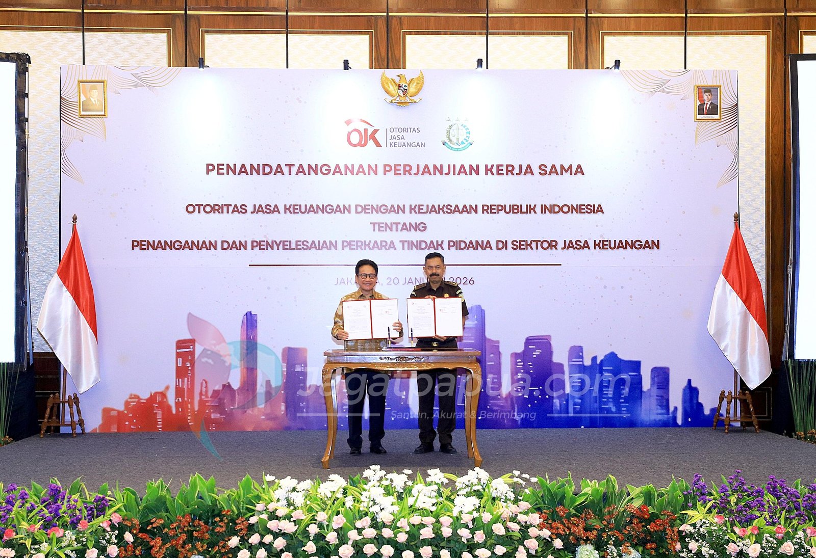 JAKARTTA, JAGATPAPUA.com – Otoritas Jasa Keuangan (OJK) dan Kejaksaan Republik Indonesia resmi memperkuat sinergi dalam penanganan dan penyelesaian perkara tindak pidana di sektor jasa keuangan. Penguatan kerja sama tersebut ditandai dengan penandatanganan Perjanjian Kerja Sama (PKS) di Jakarta, Selasa (20/1/2026).