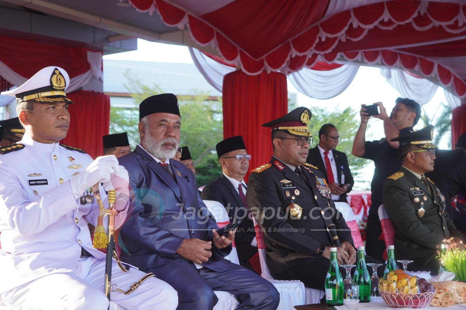 Gubernur Papua Barat menyampaikan sambutan yang menekankan pentingnya persatuan, kerja sama, dan semangat gotong royong dalam mengisi kemerdekaan, khususnya untuk kemajuan pembangunan di Papua Barat.